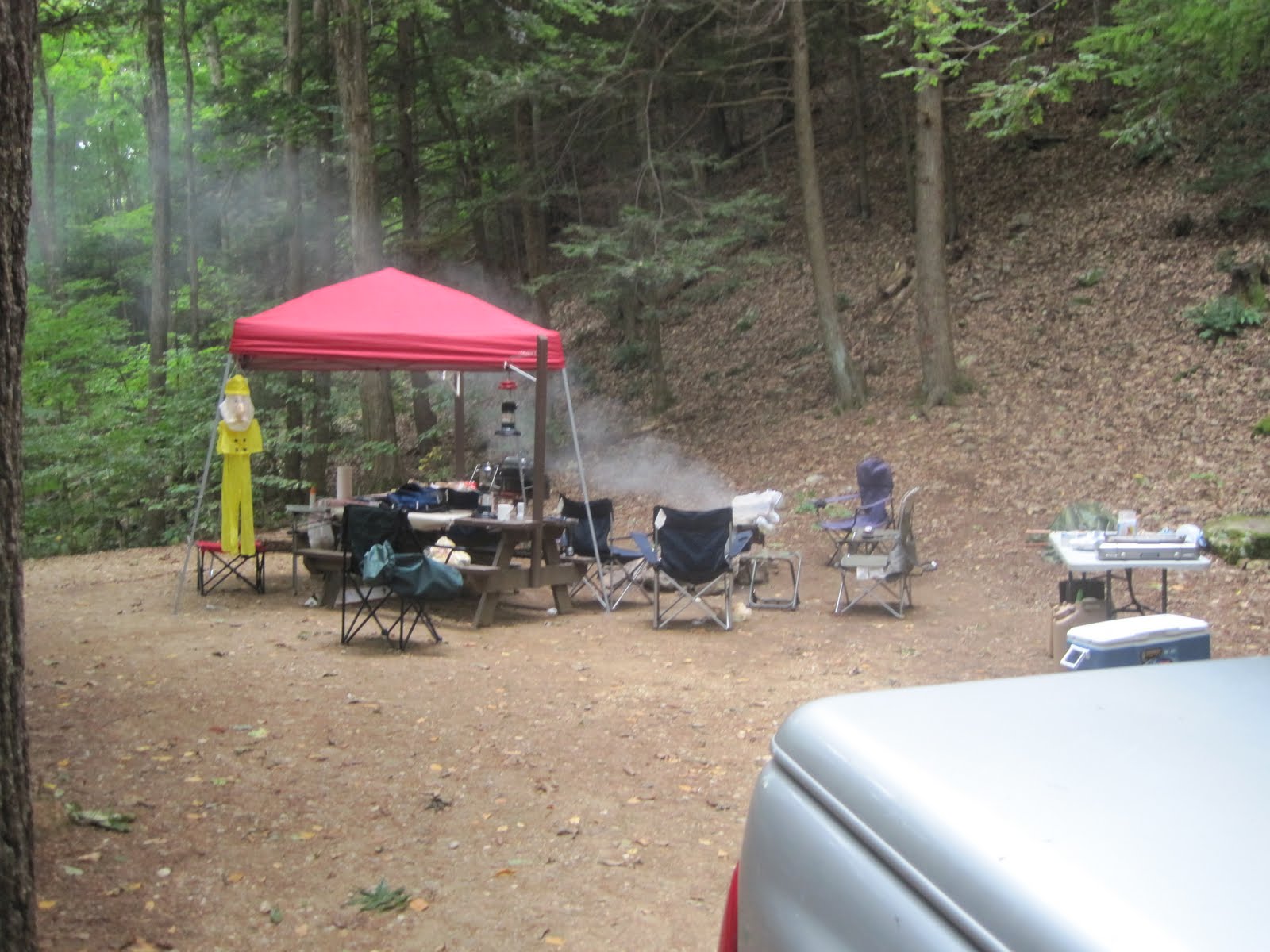 Last year we stayed at Myles Standish state park near Plymouth MA. I have a laundry list of complaints about it, including things out of its control like the weather being absolutely freezing. They had a designated Fire area, which was tiny, ensuring all of us were chilled to the bone the entire time. Let me just say, I grew up in update Vermont on the Canadian border... I know cold. Hell I like cold, but this was too much even for me. Bear got sick on the trip and spent most of the time sleeping, I got an ear infection and everyone else came down with a cold or the flu. Despite all that we had a good time, but I wouldn't say we spent much of the weekend comfortable.This year was totally different. Wells State Park provided us with two isolated tent sites. The weather was absolutely perfect, and despite being much warmer there were still less bugs. The layout of our adjoining campsites couldn't have been better suited to our needs. We had an excellent area around the campfire with which to do our gaming and a couple of picnic tables where we had our battlemat for when a shootout broke out. I couldn't have been more comfortable... I had great food, a great game, and great friends. More than ever I highly recommend your group look into its own weekend camping getaway. It is cheap and easy for everyone and as I said, it is a great time.